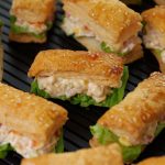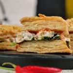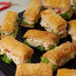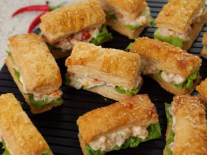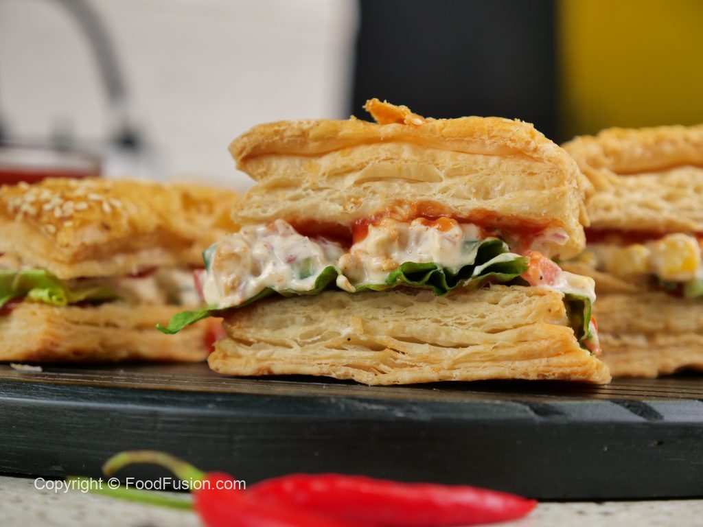 -Add tomato ketchup on both sides,place salad leaf on one side,add prepared filling & flip the other side of puff pastry biscuit & serve (makes 18-20).