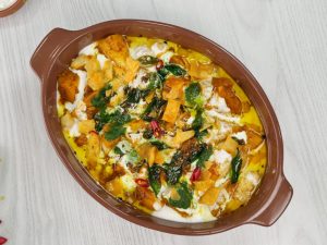 -In a serving dish,add phulkiyan,prepared dahi mixture,prepared khattay aloo,dahi mixture,green chutney,prepared tarka,papri & serve!