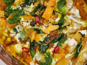 -Serving dish mein phulkiyan,tayyar dahi mixture,tayyar khattay aloo,dahi mixture,green chutney,tayyar tarka aur papri dal ker serve karein!