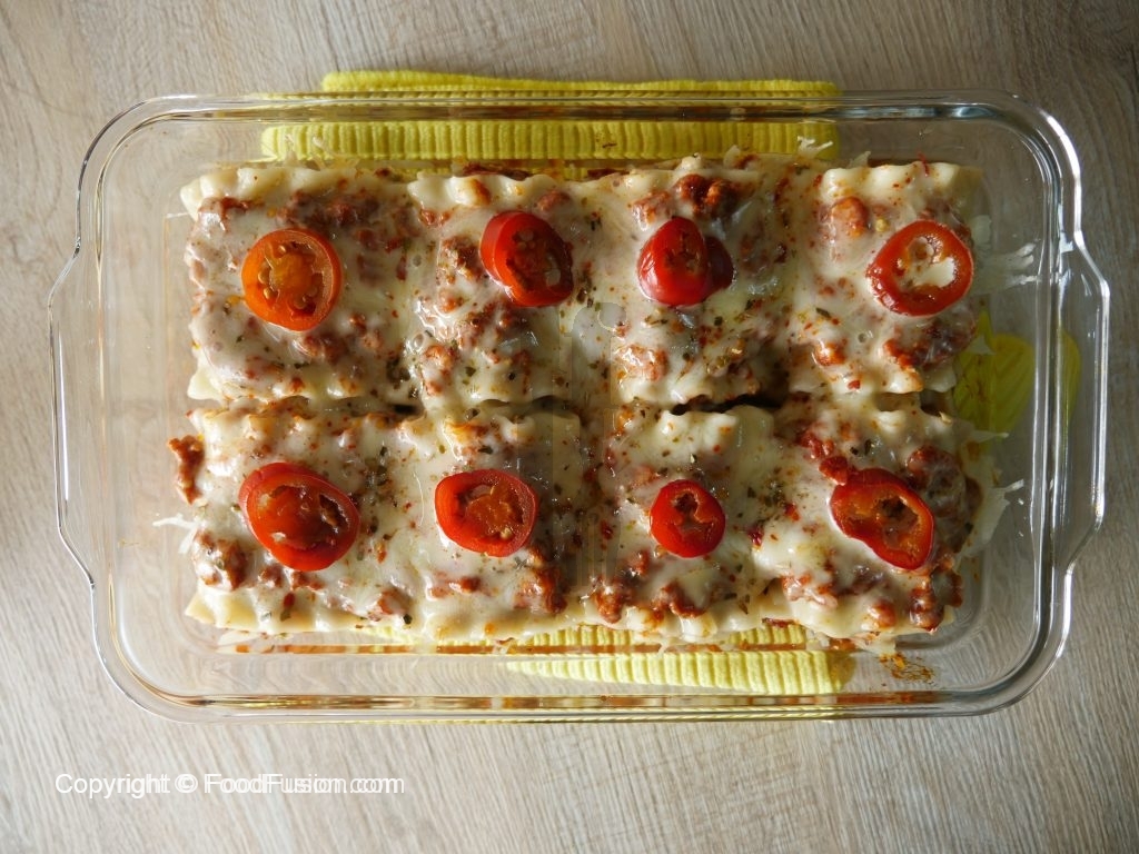 On lasagna sheets,add and spread white sauce,red sauce with mince and roll up.