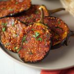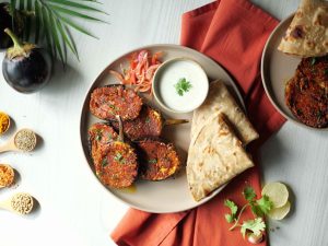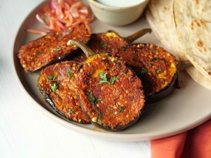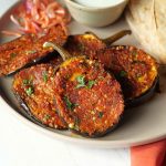 -Cut eggplant in slices vertically,make diagonal cuts on it to create diamond shape grid,apply prepared spice mix on both sides & rub gently.