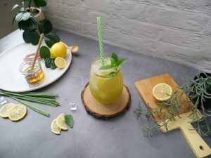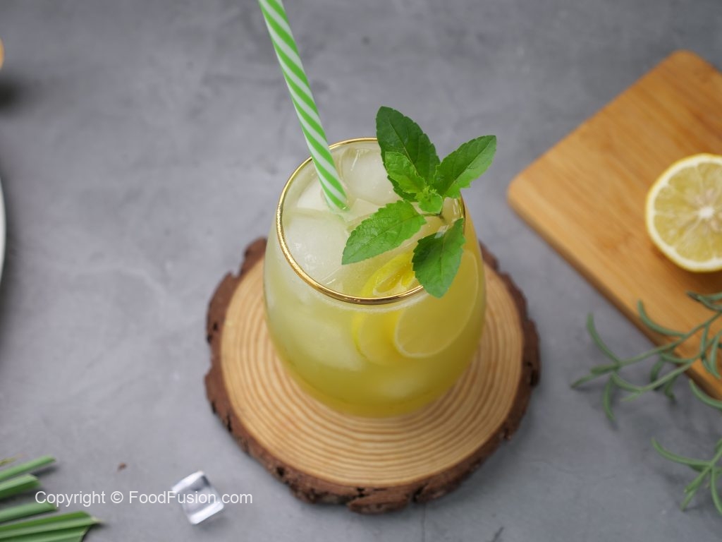 -Blender jug mein lemon,fresh basil leaves,lemon grass,tayyar green tea aur honey dal ker ache tarhan blend ker lein & side per rakh dein
