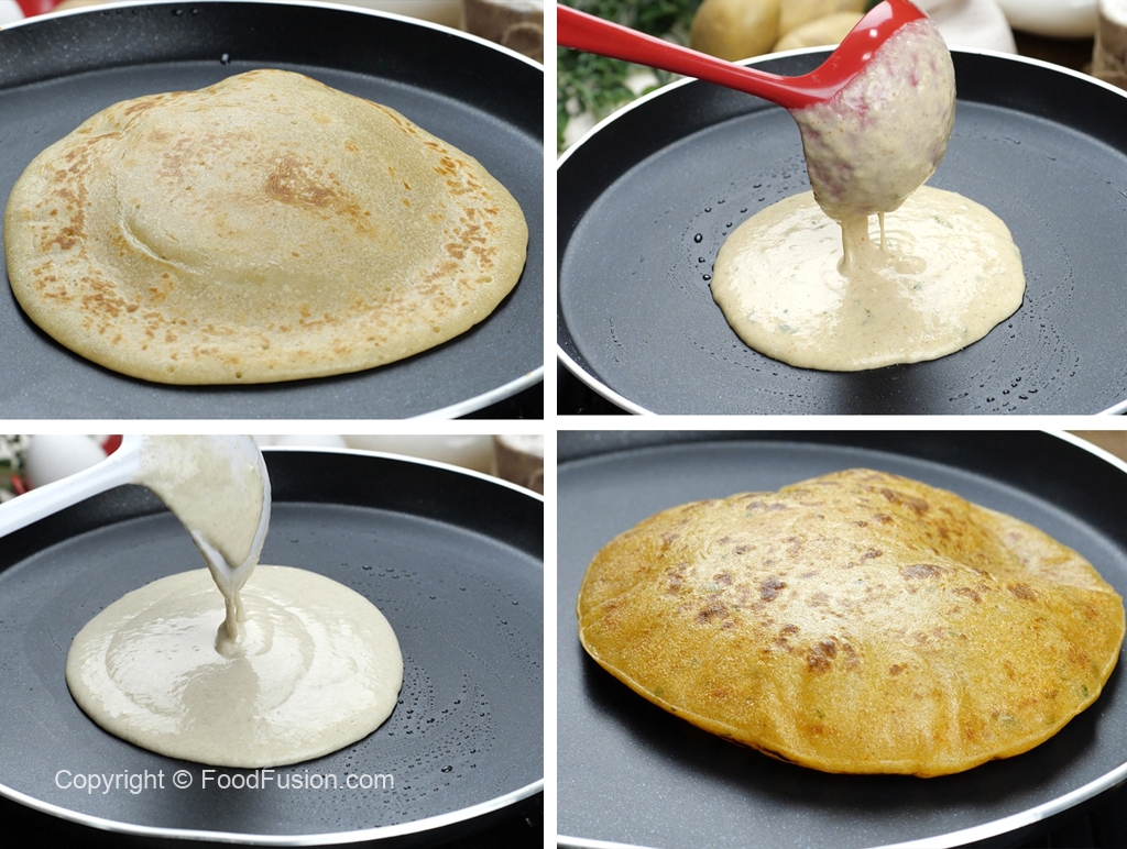 Pour prepared batter with the help of ladle & spread evenly,cook on low flame until it changes color then flip and apply oil/ghee in between (makes 6).