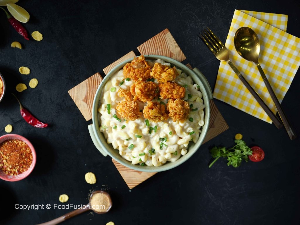 Mac & Cheese with Popcorn Chicken — a lunchbox favorite and comfort food classic! Creamy, cheesy pasta paired with crispy chicken bites makes every bite a treat. Perfect for school, work, or a cozy meal at home! #happycookingtoyou #foodfusion #araywahh #lunchboxideas