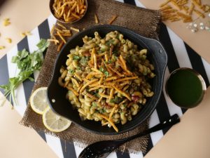 In a bowl,add macaroni,chickpeas,potatoes,onion,tomato,green chilli,cumin seeds,red chilli crushed, chaat masala,prepared green chutney (2 tbs),prepared meethi chutney (2 tbs) & mix well.