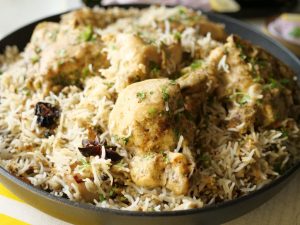 -In remaining gravy,add mint leaves,fresh coriander,fried onion,layer half quantity of boiled rice, reserved gravy,mint leaves,fresh coriander,fried onion,remaining rice,fried onion,steam cooked chicken with gravy,fresh coriander,cover and steam cook on low flame for 15-18 minutes.