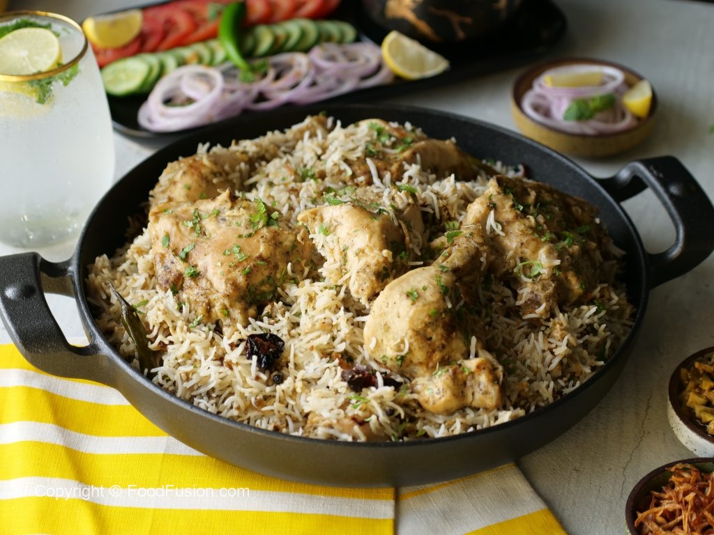 -Remaining gravy mein podina,hara dhania,fried pyaz,boiled chawal ki half quantity,reserved gravy, podina,hara dhania,fried pyaz,remaining chawal,fried pyaz aur steam cooked chicken gravy ka saath dal ker dhak dein aur halki ancch per 15-18 minutes kliya steam cook ker lein.