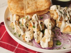 -Drizzle creamy garlic sauce over malai tikka bites,sprinkle fresh coriander & serve with puri paratha, green chutney & onion rings.