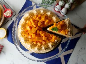 Sponge cake ki base per mango puree aur mango frosting dal ker pheela lein aur mango cubes dal dein,mango frosting dal ker upper sa cake ki top layer rakh ker gently press ker lein.