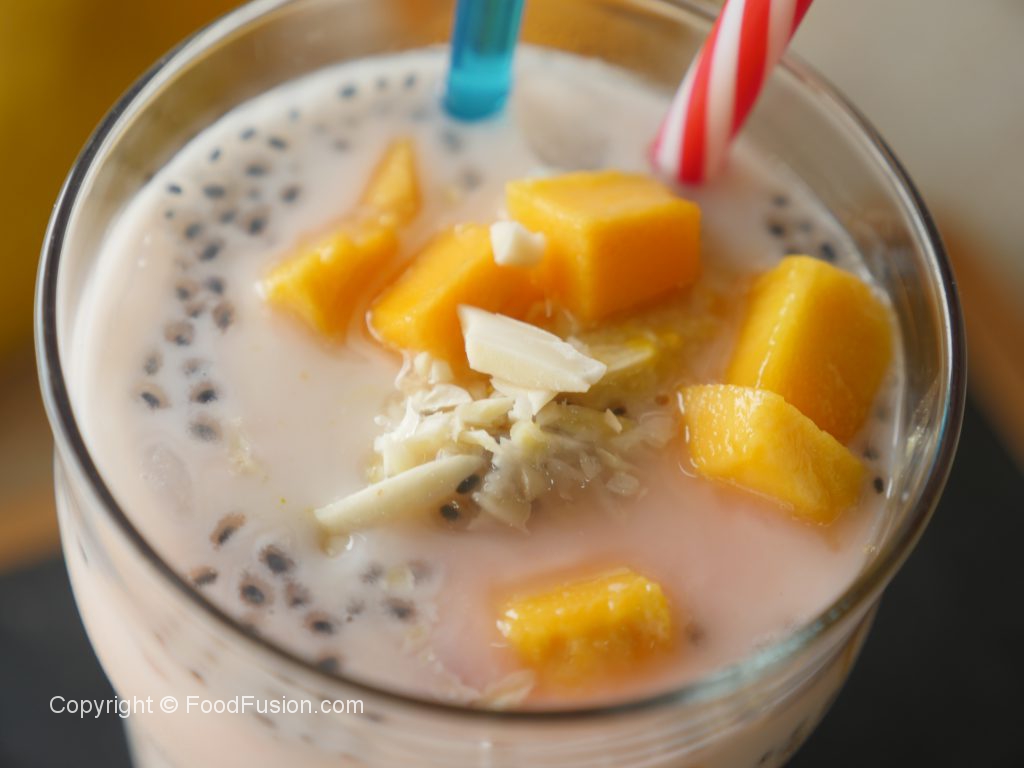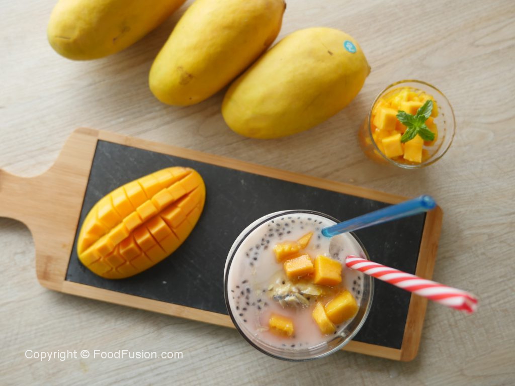 In serving glass,add mango cubes,basil seeds,red syrup,ice cubes,corn flour vermicelli,almonds,mango kulfi,chilled prepared milk,basil seeds,almonds,mango cubes & serve!