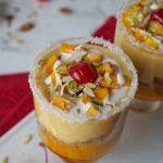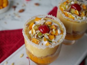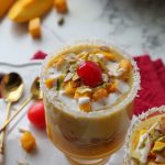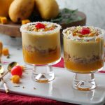 -Now add reserved mango puree,balushahi (crush with the help of hand),prepared mango rabri, mango chunks & garnish with cream,pistachios,almonds,cherry & serve chilled!