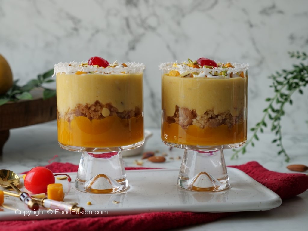 -Reserved mango puree,balushahi (crush with the help of hand),tayyar mango rabri & mango chunks dal dein,cream,pista,badam aur cheery sa garnish ker ka thanda serve karein!