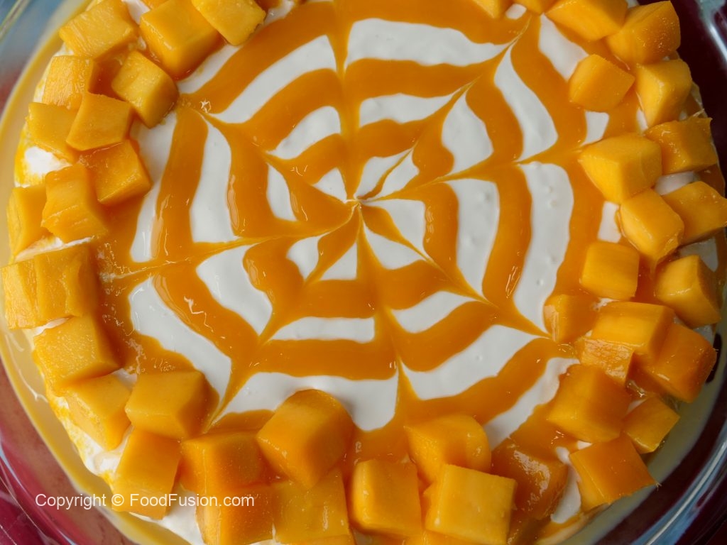 Cream,mango puree aur mango cubes sa garnish ker lein.
