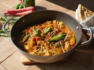 -Add carrot,peas,cauliflower,potatoes,french beans,mix well & cook on medium flame for 3-4 minutes.