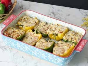 In baking dish,place capsicum and yellow bell pepper and microwave for 2 minutes.