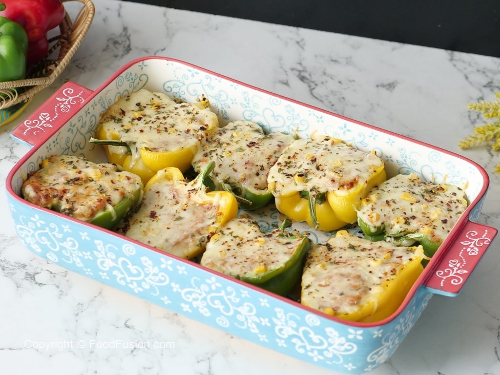 Stuffed with prepared mince filling and add cheddar cheese,mozzarella cheese,corn kernels,dried parsley and red chilli crushed.