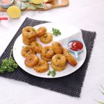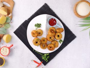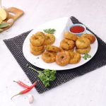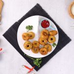 -With greased hands,take a small quantity of mixture (30g),make a ball & press a finger in the center to make a hole to create a donut like shape (makes 35).