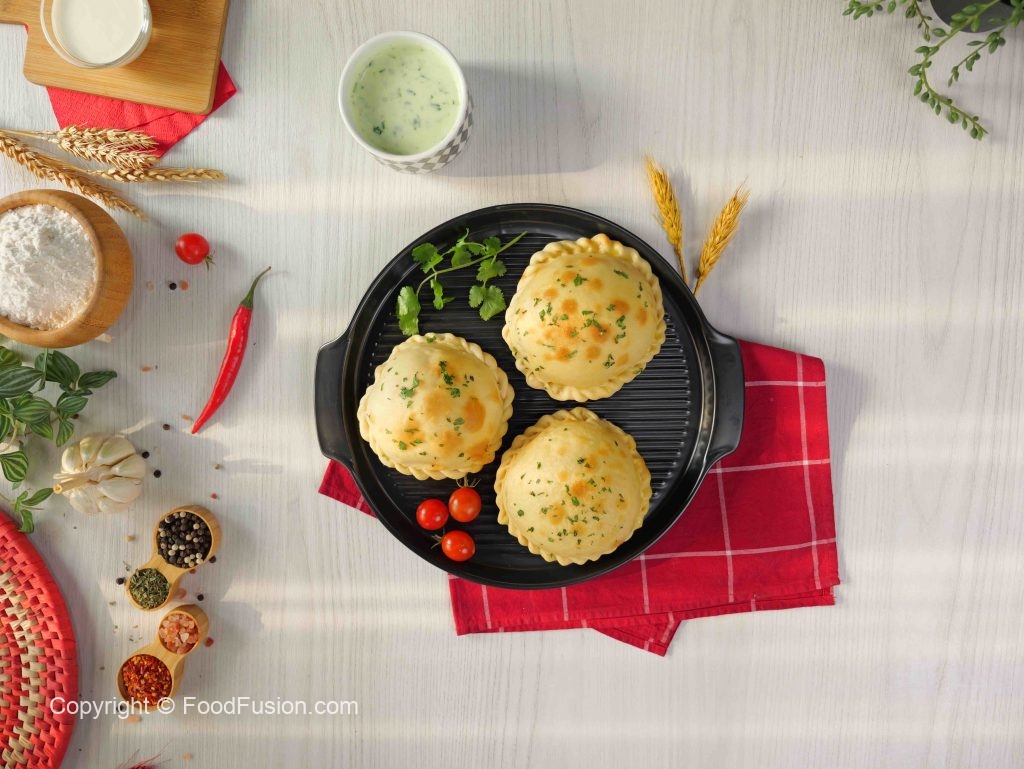 -Add prepared chicken filling in the center of the circle dough, add mix cheese, green chilli, fresh coriander.