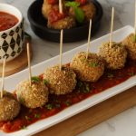 Serve mozzarella balls with marinara sauce & garnish with fresh parsley.