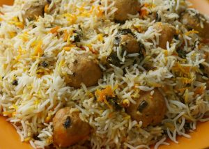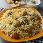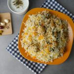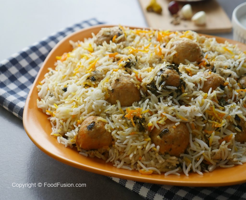 In pot,add half quantity of boiled rice,meat balls with gravy,mint leaves,fresh coriander and remaining quantity of boiled rice.