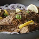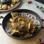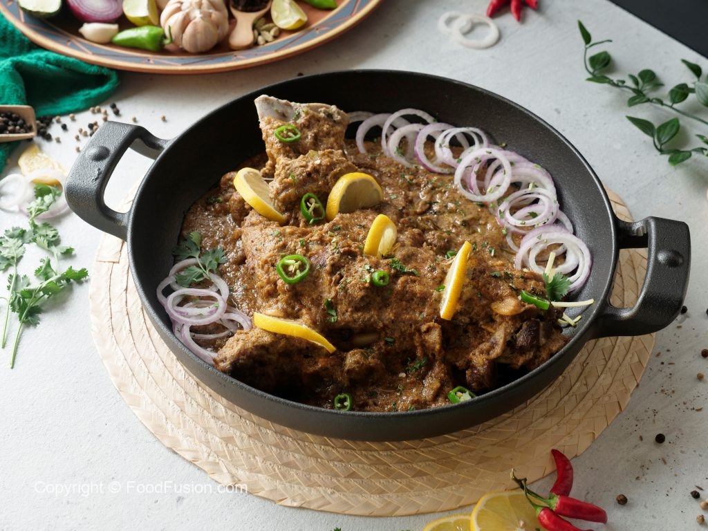 Fried mutton leg/dasti dal ker upper sa gravy dal dein aur dhak ker halki ancch per gul janay tak paka lein (1 & ½ hour) & bech bech mein rotate & flip ker lein.