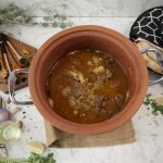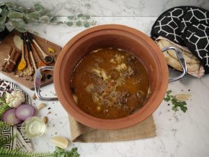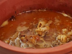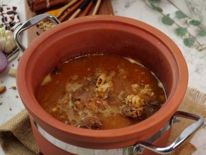 In mutton trotters,add salt,black cardamom,cloves,black peppercorns,cinnamon sticks,bay leaf,ginger garlic paste,hot water and mix well,bring it to boil,cover and cook on low flame until tender (2-3 hours) 3 cups of water should be left.