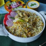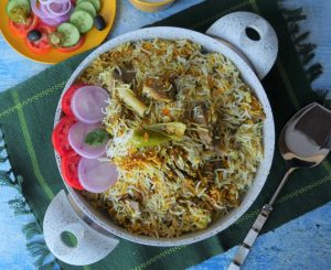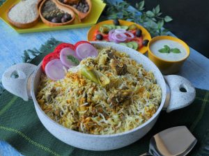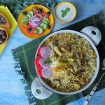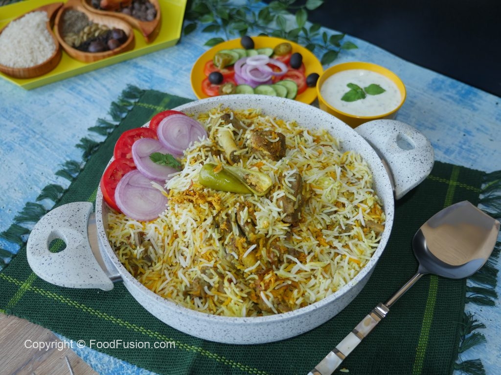 In a pot,add half quantity of boiled rice,prepared mutton qorma,khoya,fried onion,spiced yogurt,green chillies,remaining boiled rice,cover & steam cook on low flame for 18-20 minutes.