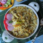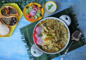 Pot mein boiled chawal ki half quantity,tayyar mutton korma,khoya,fried pyaz,spiced yogurt,hari mirch aur baqi bachay hoye boiled chawal dal dein aur dhak ker halki ancch per 18-20 minutes kliya steam cook ker lein.