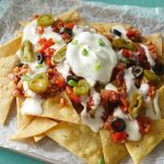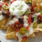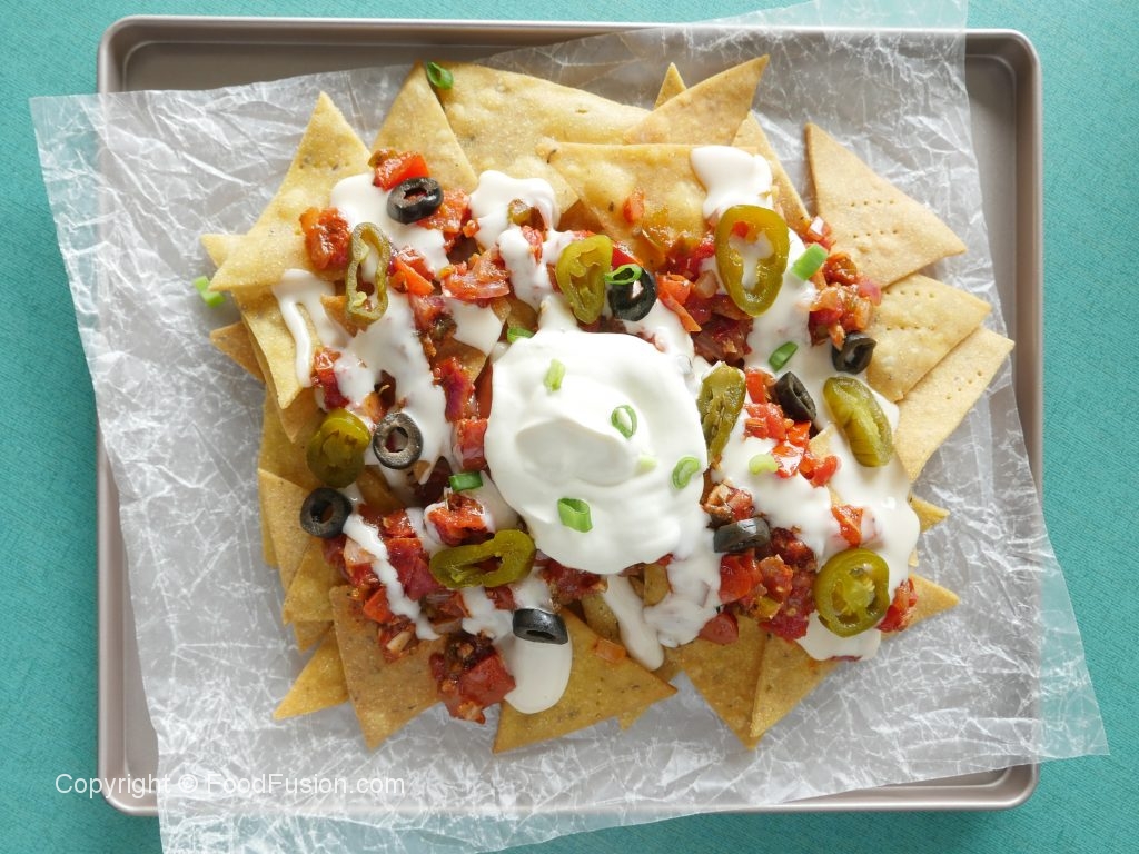 Top nachos with salsa,cheese sauce,jalapenos,black olives,green onion leaves,sour cream & serve!