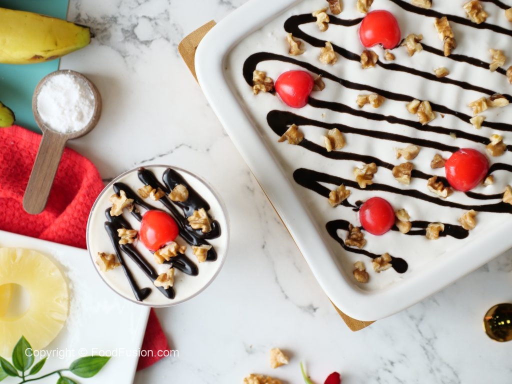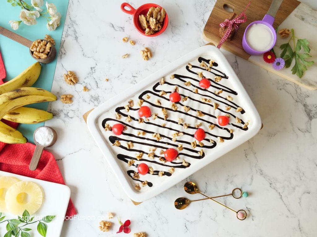 No Bake Banana Split Cake is Super Quick and always hit. Layers of Bananas topped over with the goodness of Olper’s Dairy cream make this dessert so decadent. #OlpersDairyCream #GoodnessBarhjaye #FoodFusion #olpers #HappyCookingToYou #Cake #Recipes