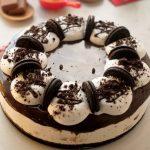 Remove springform pan and decorate with whipped cream,oreo biscuits,melted chocolate & crumbled biscuit.