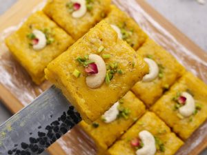 In a bowl,add white cooking chocolate and microwave for a minute,mix well & set aside.