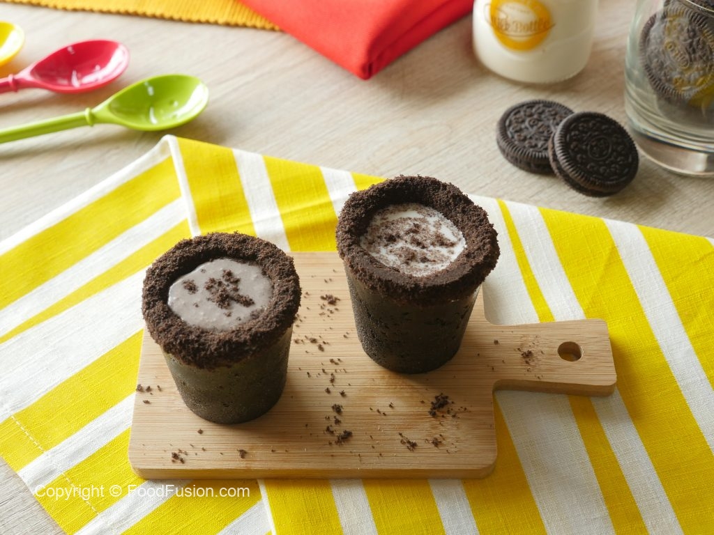 Oreo shots ko molds mein sa nikal lein aur oreo shots glasses ki rims ko cream mein dip ker ka crumbled oreo biscuits mein coat ker lein.