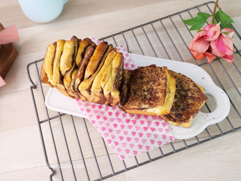 -On 3”x7” inch pan greased with butter,place bread pieces & tap few times,cover & let it rest for 30 minutes & apply egg wash with the help of brush.