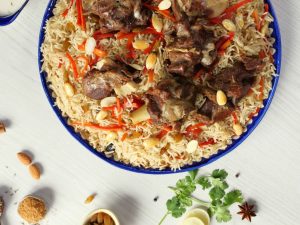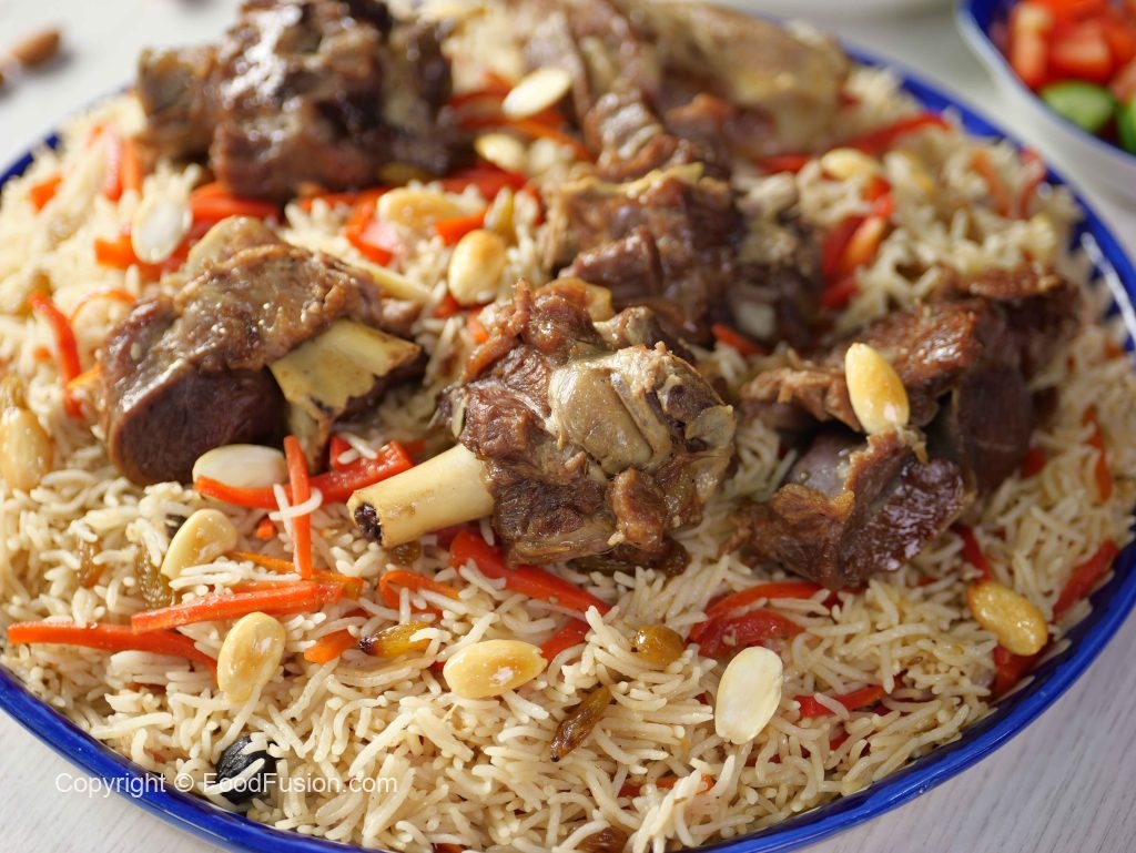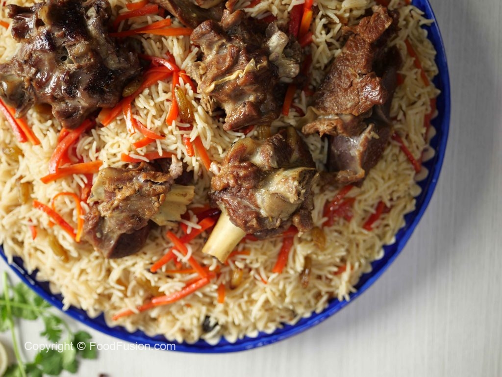 -Phir ismein carrots aur raisins (aadhe garnish ke liye rakh lein), aur cooked mutton pieces daal dein.