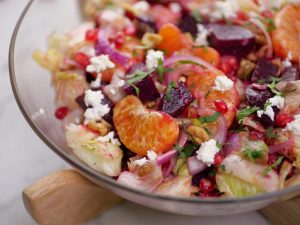 -In a bowl,add iceberg lettuce,onion,orange,pomegranate seeds,beetroot,walnuts,prepared salad dressing & give it a good mix.