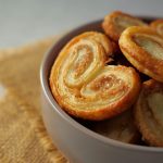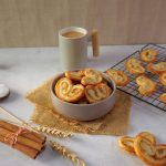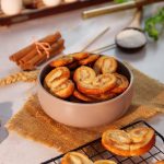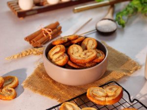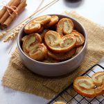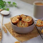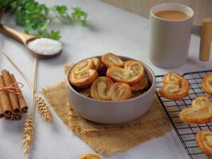 -Sprinkle cinnamon & sugar mixture,fold 1 & ½ inch rolled puff-pastry from left & right for 3 times and refrigerate for 10 minutes then cut into ½ inch slices & make heart shape & place in a baking tray (greased & lined with baking paper),brush egg white & sprinkle caster sugar.