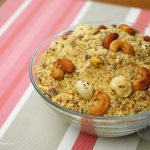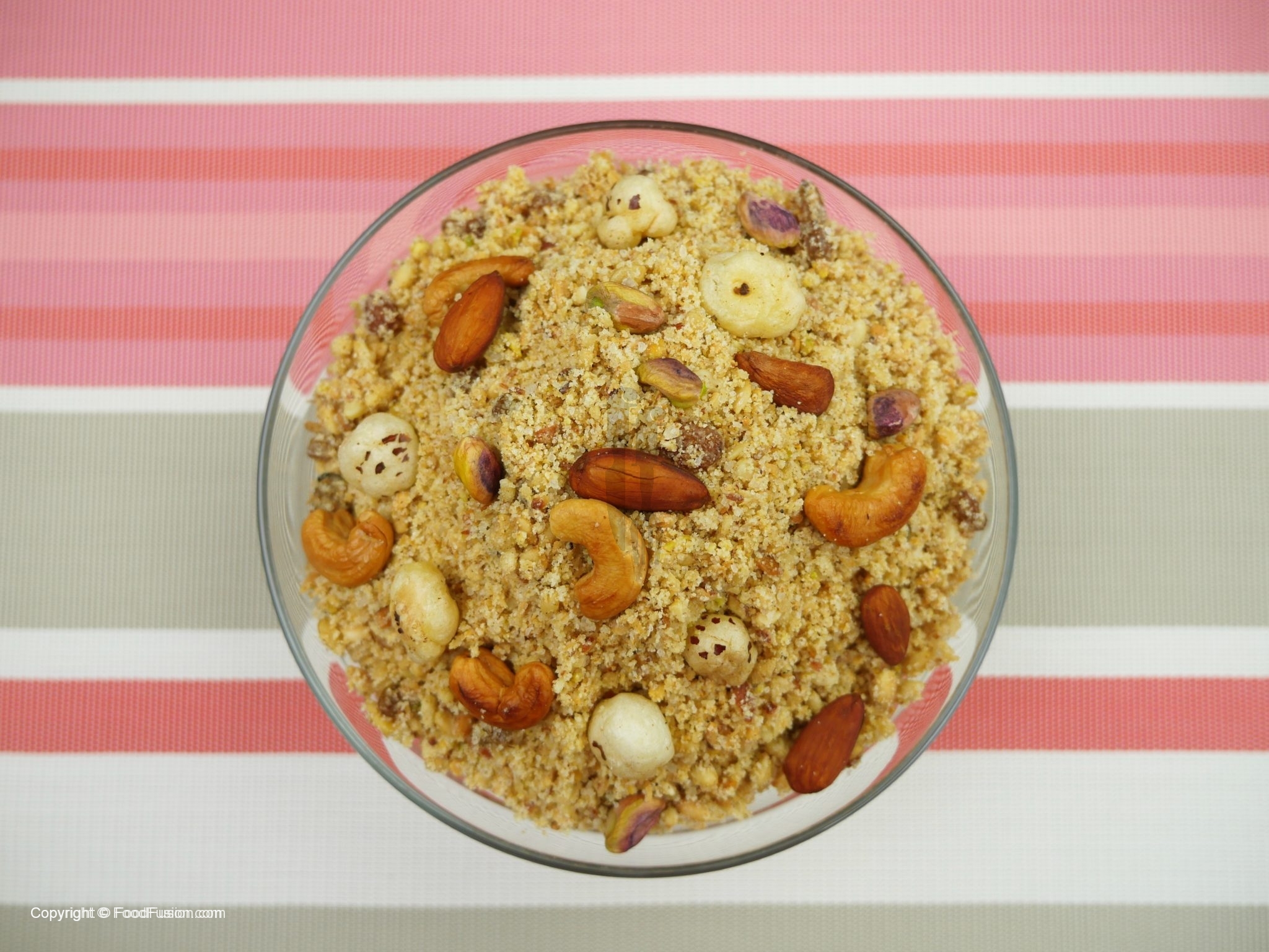 In bowl,add semolina mixture, coarsely ground fried nuts,dried melon seeds & raisins and powdered sugar,mix until well combined.