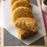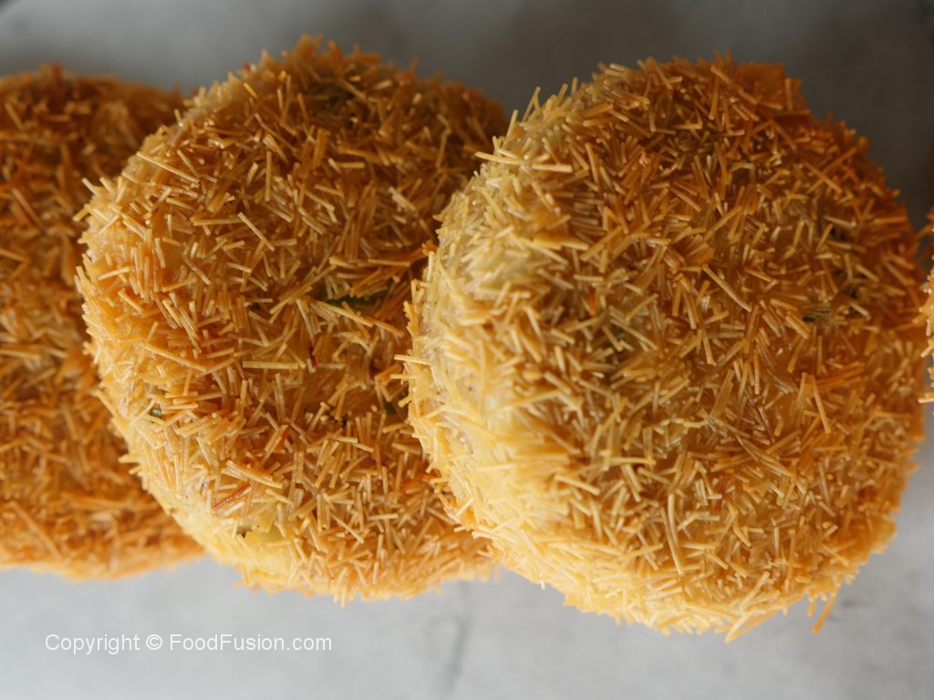 Dip kabab into beaten eggs then coat in crushed vermicelli (makes 8-10).