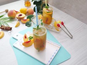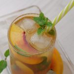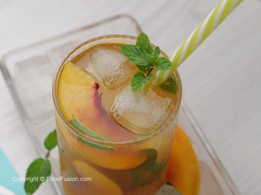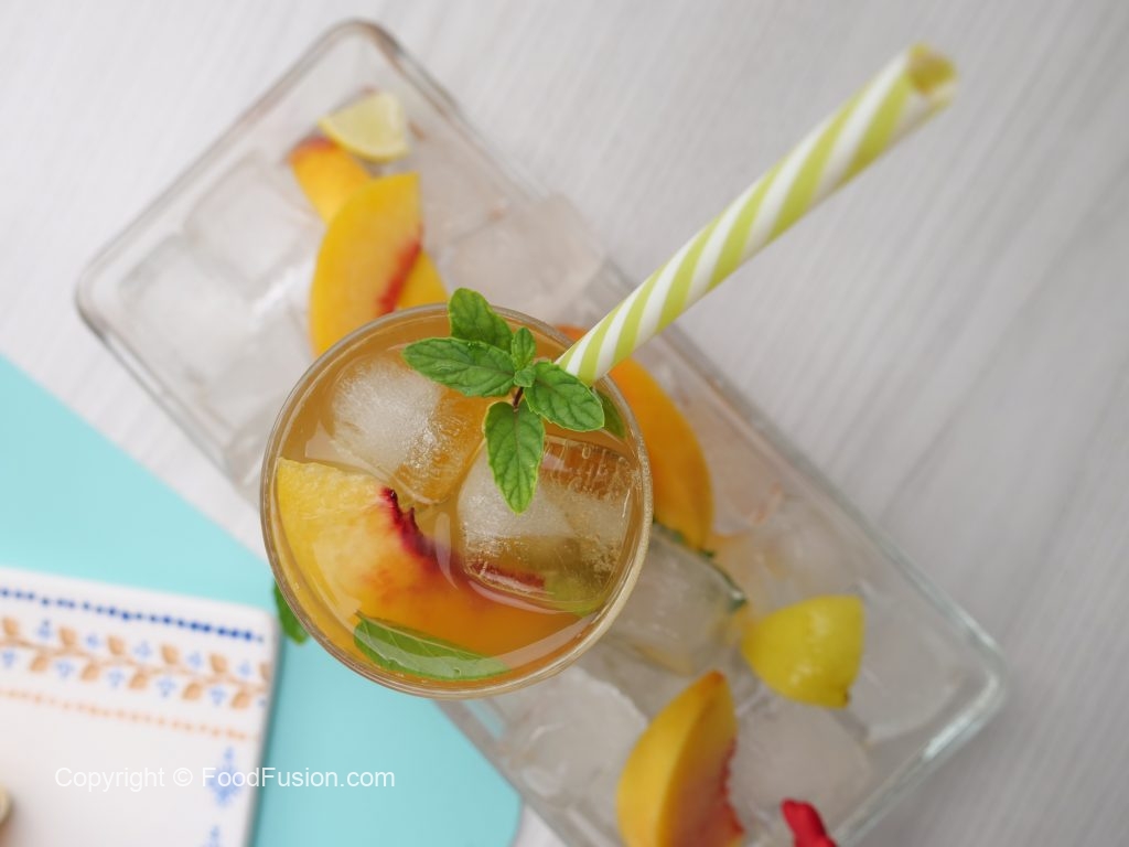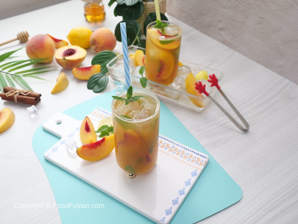 -In a serving glass,add ice cubes,peach slices,prepared green tea (3/4 cup),prepared peach mixture (1/4 cup),mint leaves & stir.