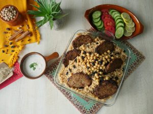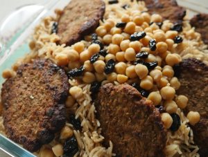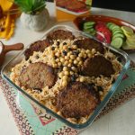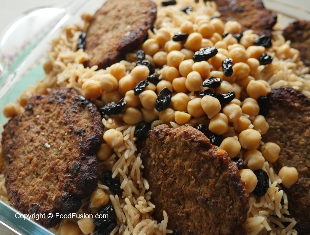 On serving dish,add cooked rice,chickpeas,reserved black raisins,peshawari beef chapli kabab on top and serve!