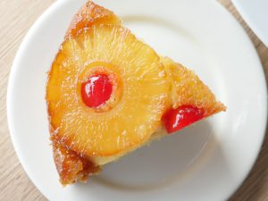 8 x 8 inch baking pan mein cooked sugar syrup dal ker pineapple rings aur cherries rakh dein aur tayyar batter pour ker lein.