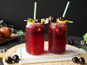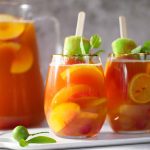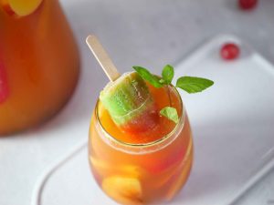-In a jug,add ice cubes,prepared lemonade,peach,red grapes,apple,lemon,orange juice,pineapple juice, sparkling water,omore traffic light & mix well.