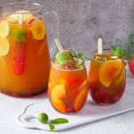 -Ab ek jug mein ice cubes, prepared lemonade, peach, red grapes, apple, lemon, orange juice, pineapple juice, sparkling water aur omore traffic light daal kar mix karen.