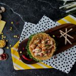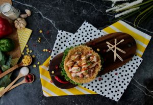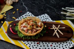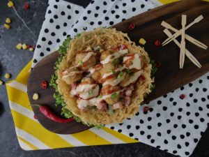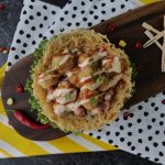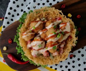 On potato nest,add vegetable filling,chicken cheese balls,drizzle prepared cheese sauce,tomato ketchup and garnish with green onion leaves & serve!