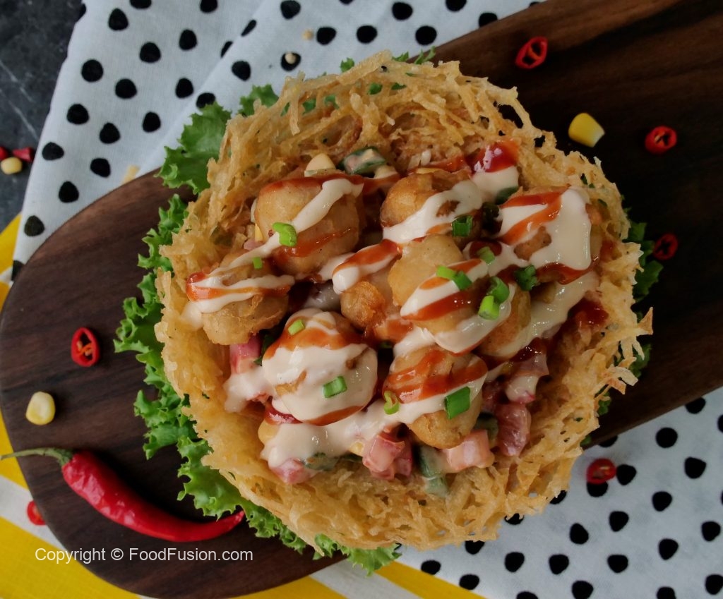 In a wok,heat cooking oil and fry potato nest on low flame until golden & crispy (press down with another sieve to hold shape).