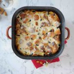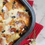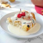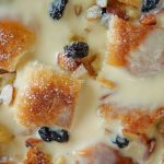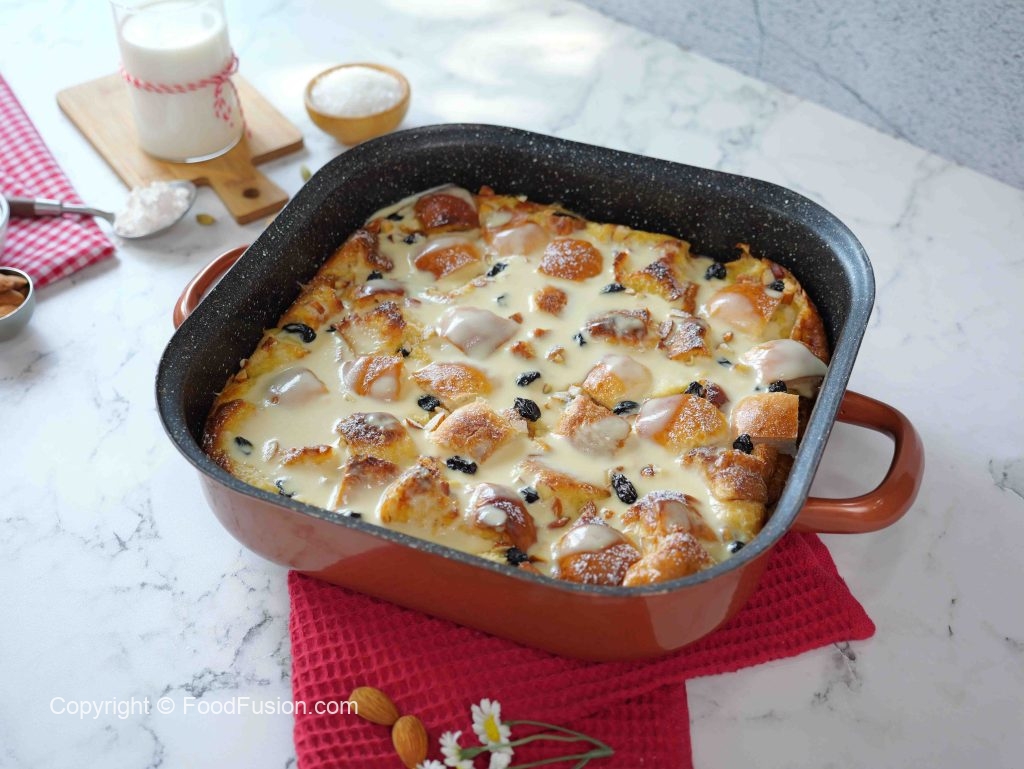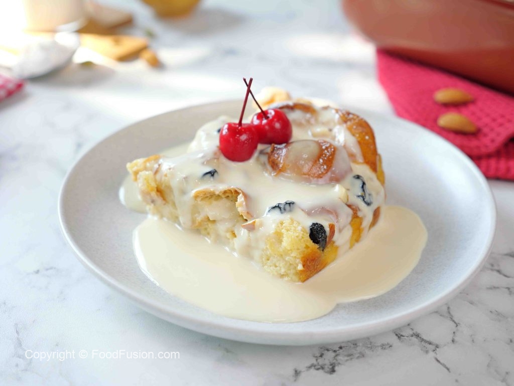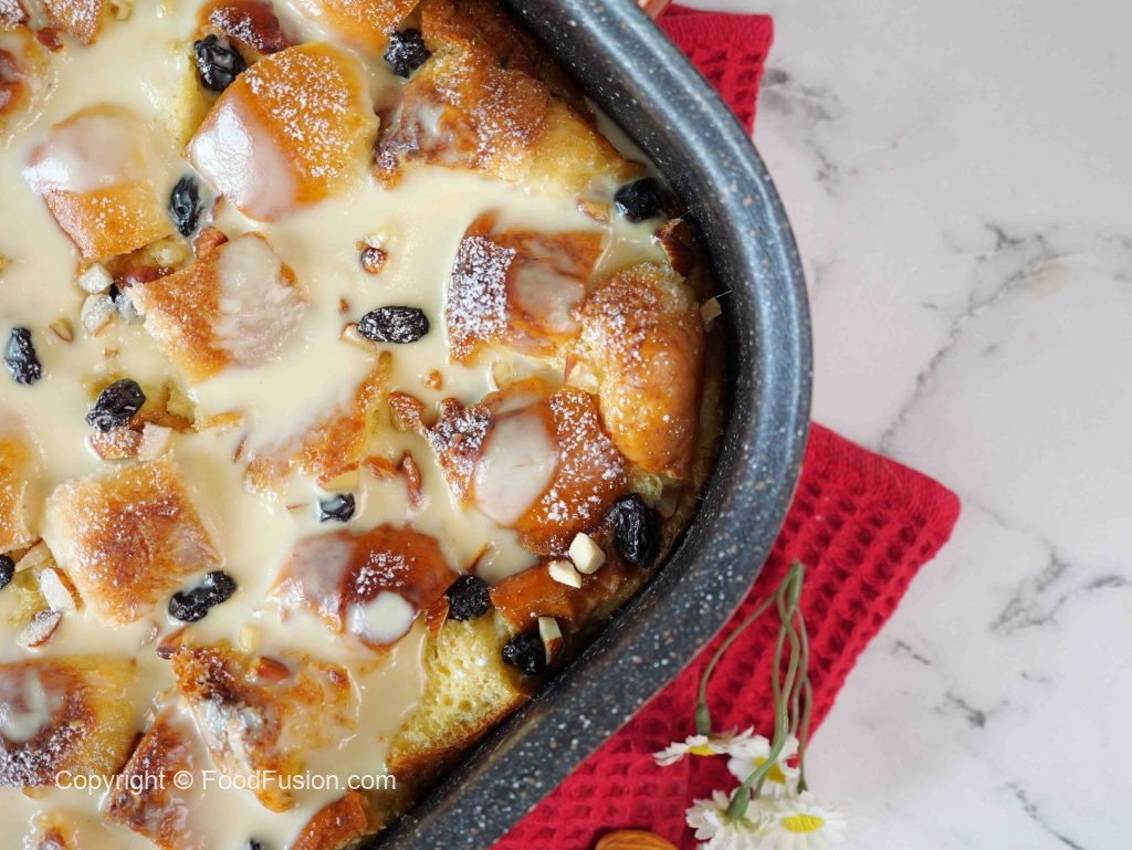 -Pour vanilla custard sauce on bread pudding, garnish with icing sugar & serve!