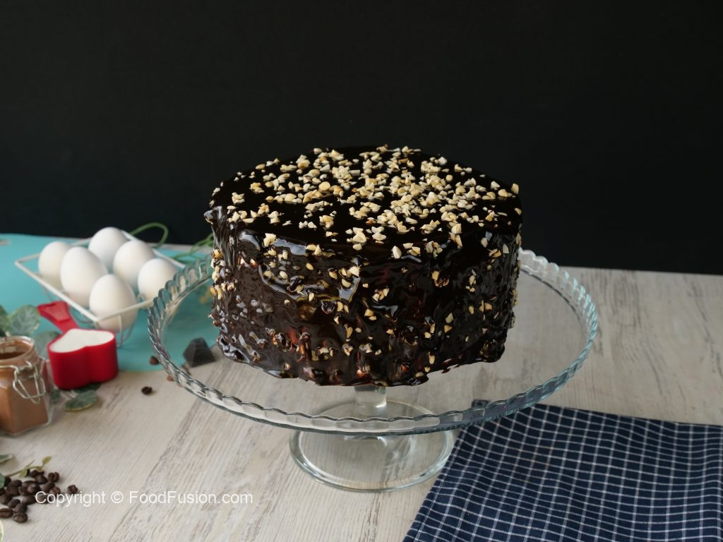 Remaining warm ganache ko cake ka upper dal dein aur peanuts dal dein.