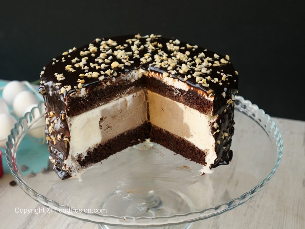 Ice cream layer sa cling film ko remove ker lein & cake layer ka upper rakh dein,chococlate ganache drizzle dal dein,ek aur cake ki layer rakh dein aur cling film sa cover ker ka 4-6 hours kliya freeze ker lein.
