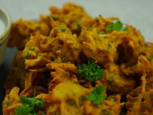 In wok,heat cooking oil and fry onion pakora on low flame until golden brown.